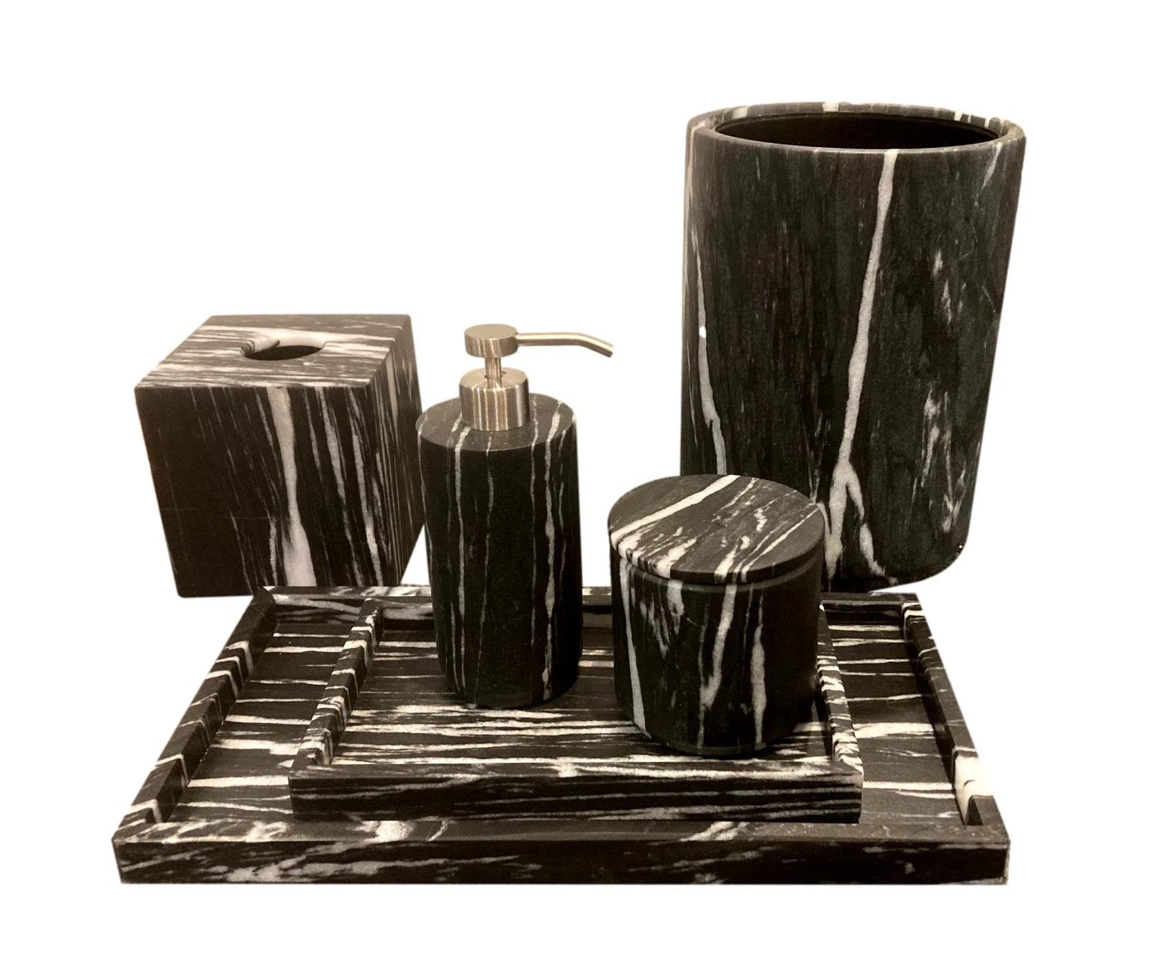 View fullsize  Black and White Honed Marble Bath Accessories  Waste Basket - DMBA036NM; Tissue Box - DMBA035NM  Soap Pump - DMBA032NM; Canister - DMBA0331NM  Small Tray -DMBA 037NM; Large Tray - DMBA0372NM