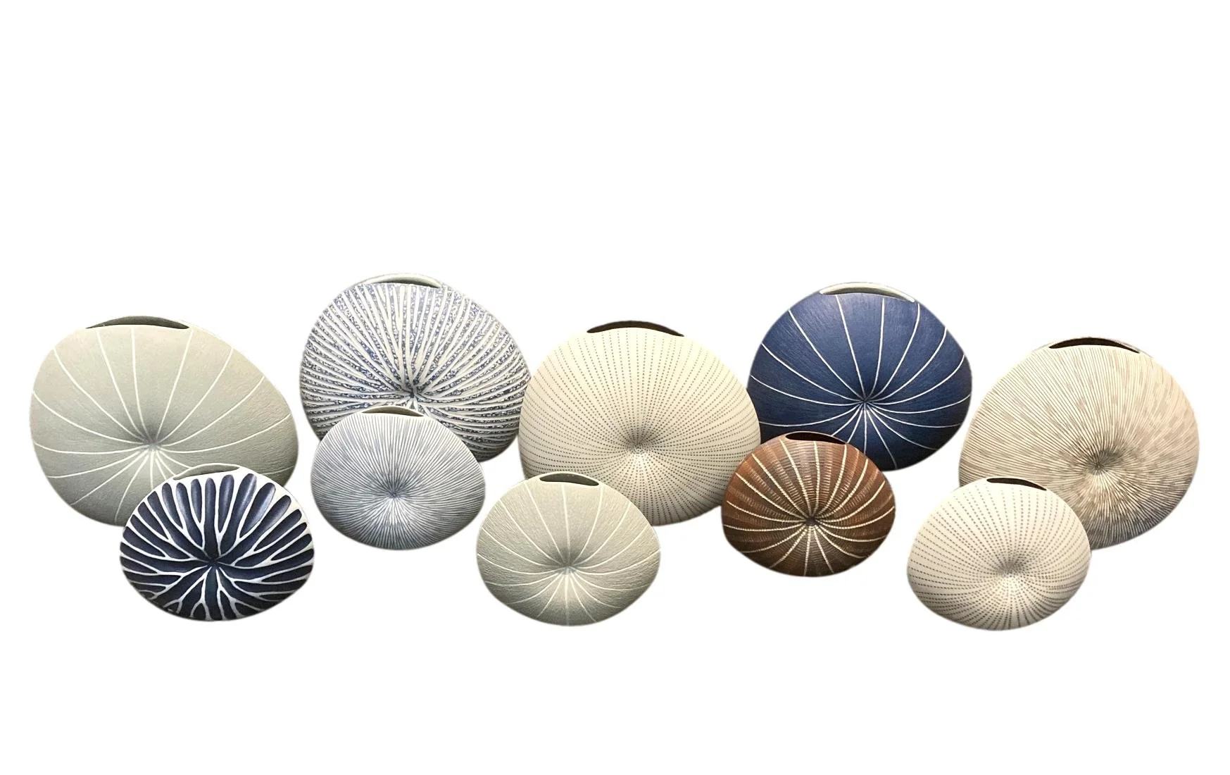 View fullsize  Small Diva Round Vase - 7x3.5x6h  Grey/White Line - FT16225GR17; Carved Blue - FT225BL16; Brown Dot - FT225W23; Blue/White Line  FT225BL17; Brown Line FT225W1  Mini Diva Round Vase - 5x2x4h  Blue/White FT226BL6;  Black Line FT226W22;  Grey/White Lin